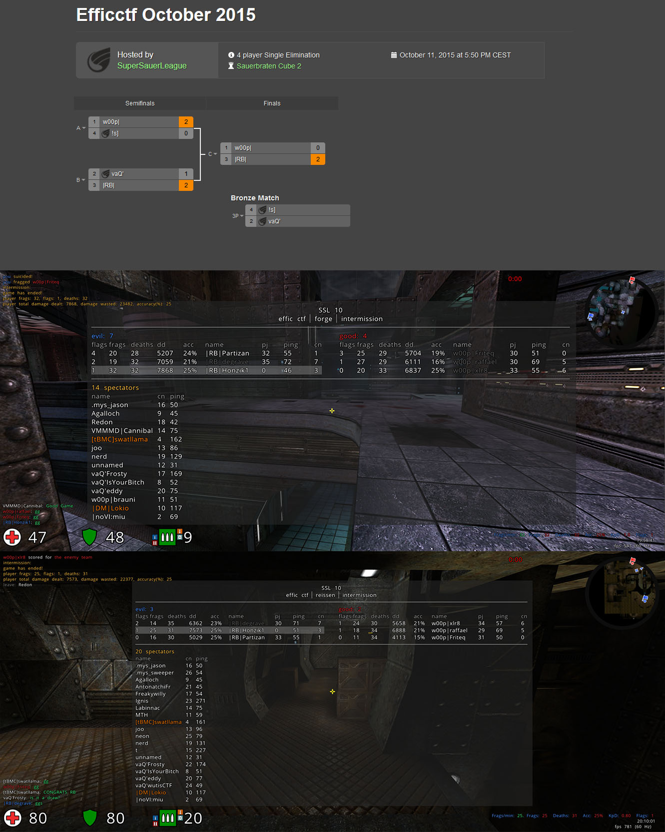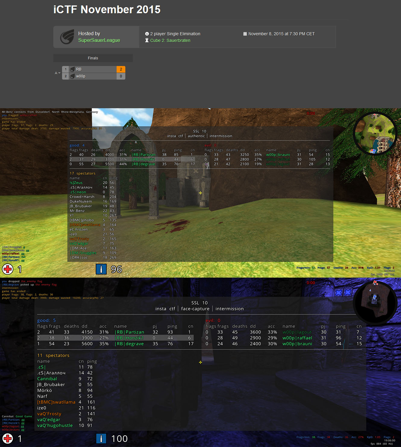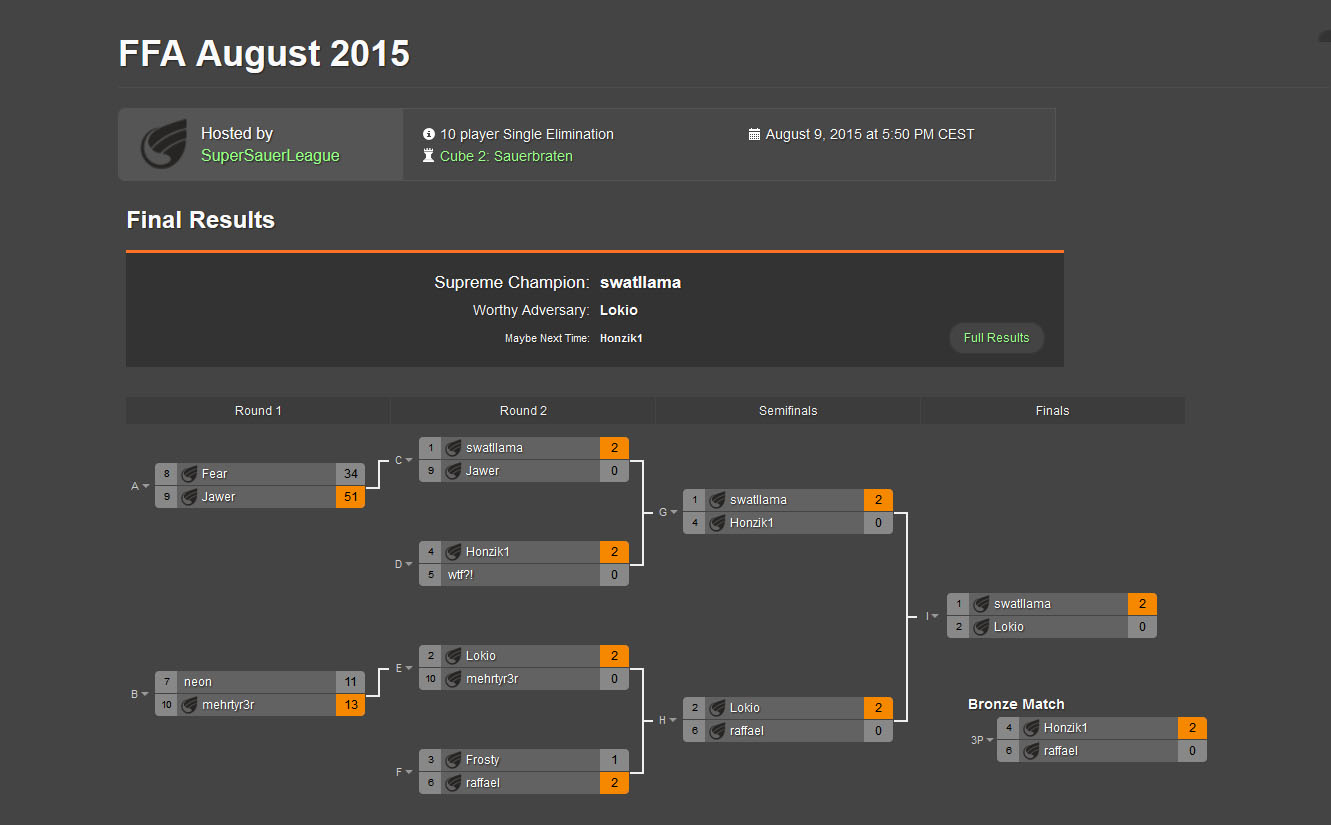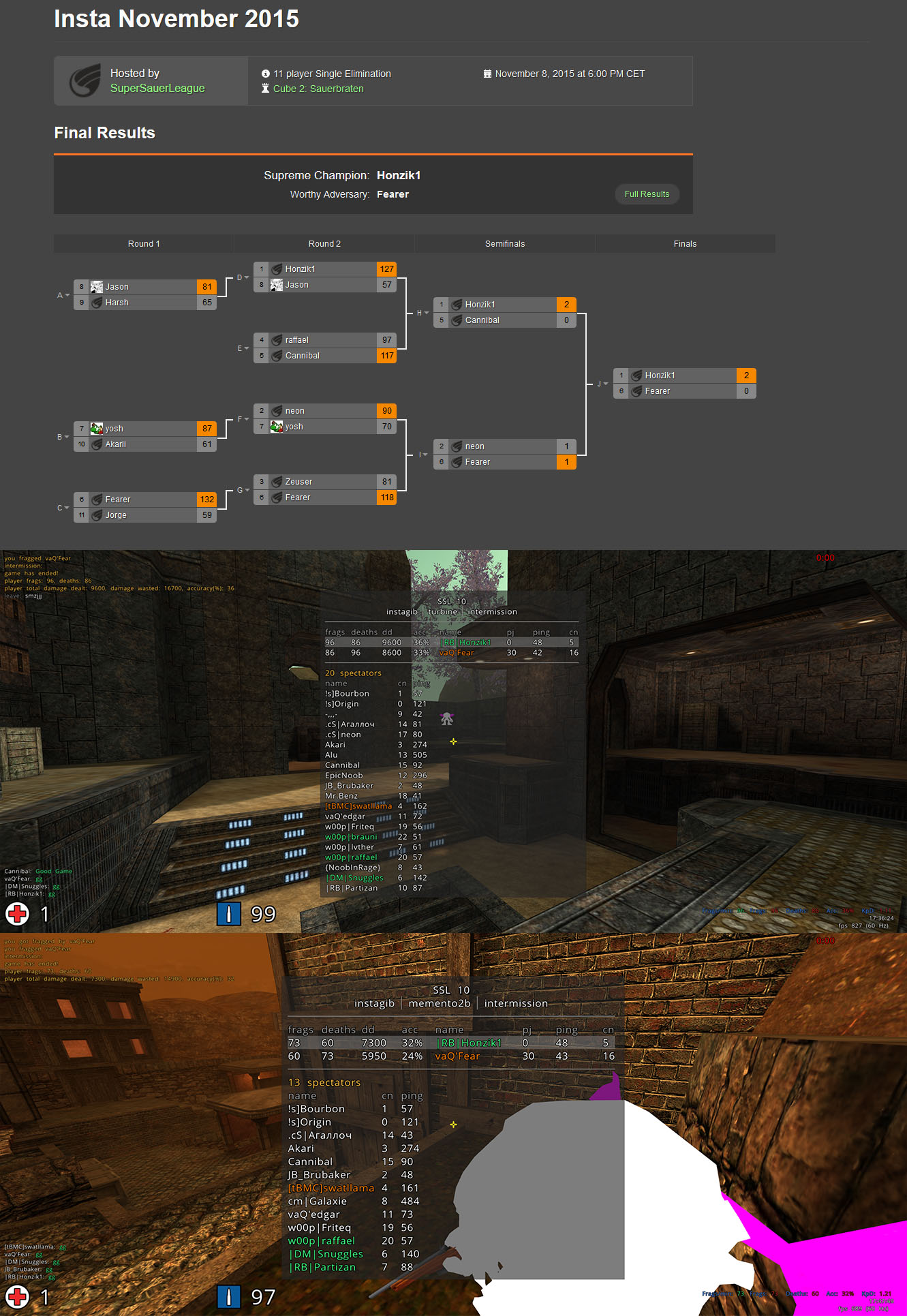 To make things a little bit more juicy, we also decided to have a poll on Sauerworld about which two uncommon maps were to be added to the map pool. Winning maps were catch22 and twinforts. Loser bracket finals map was fixed as the winning map of the poll, in this case catch22. For the Grand Finals we decided to kick out the two most played maps forge and haste.