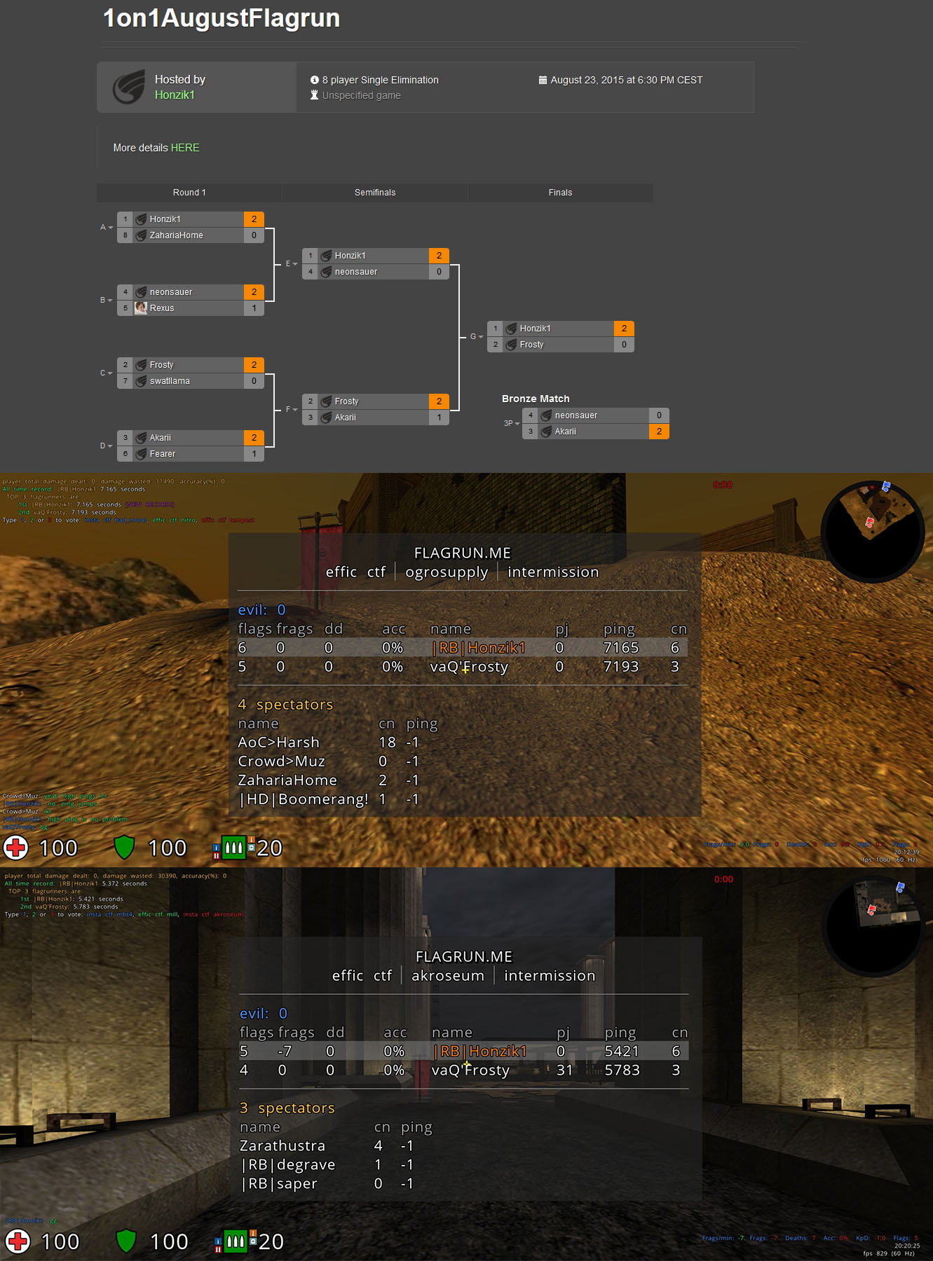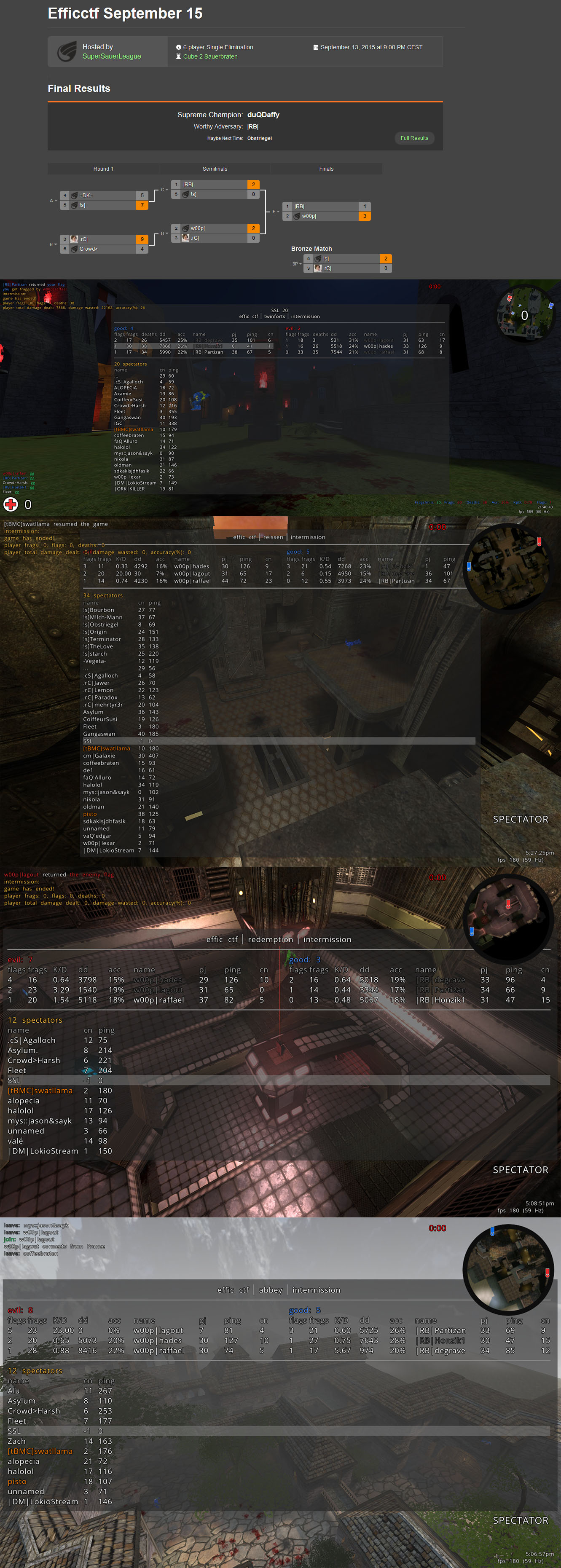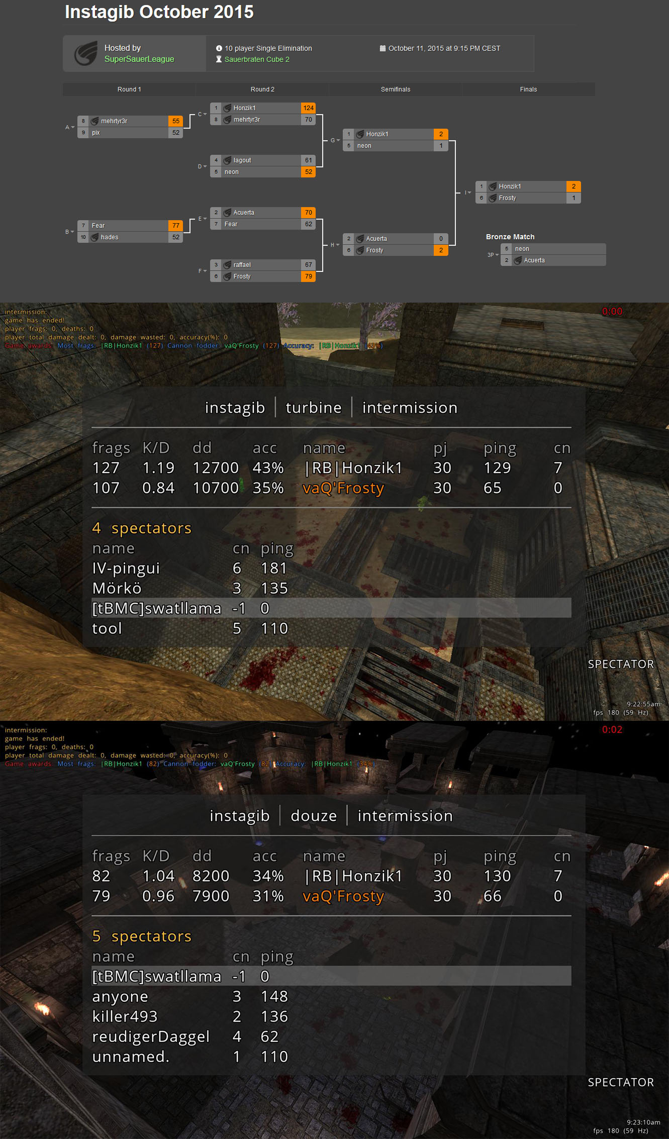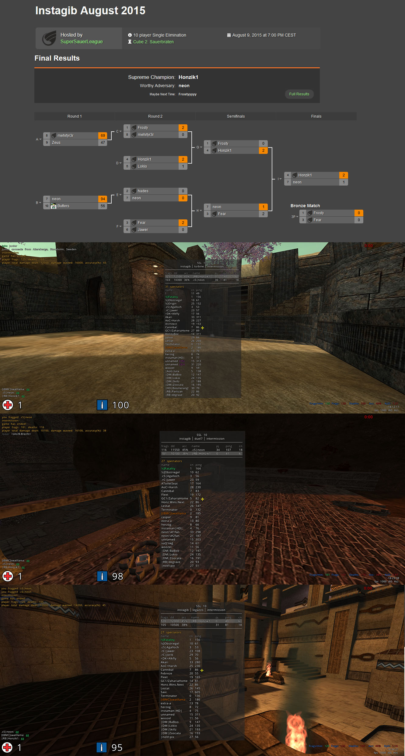 To make things a little bit more juicy, we also decided to have a poll on Sauerworld about which two uncommon maps were to be added to the map pool. Winning maps were catch22 and twinforts. Loser bracket finals map was fixed as the winning map of the poll, in this case catch22. For the Grand Finals we decided to kick out the two most played maps forge and haste.