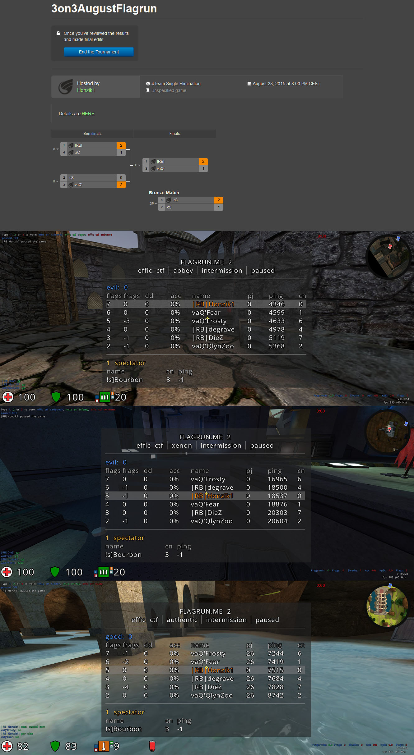 In the semi-final match RB met !s (Gangler, Savi, Dark-Fire'). First map was forge, we were playing very well there and won with the score 7:5. Next one was reissen, !s had nice gameplay and won 7:5. Decisive map was twinforts, RB had victory in hands twice in a row, but failing to pick up the flag in front of our base costed us, and we lost 6:5.
